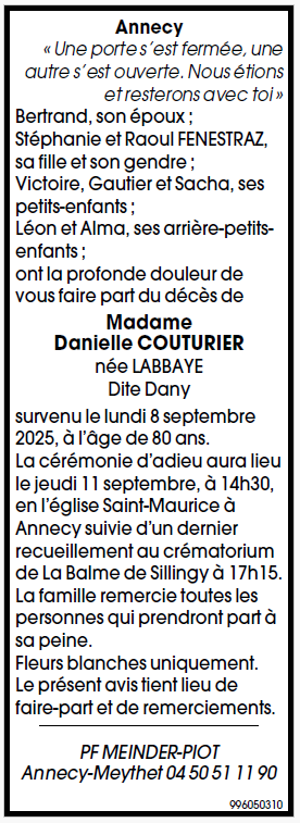 Avis de décès de Madame Danielle COUTURIER née LABBAYE