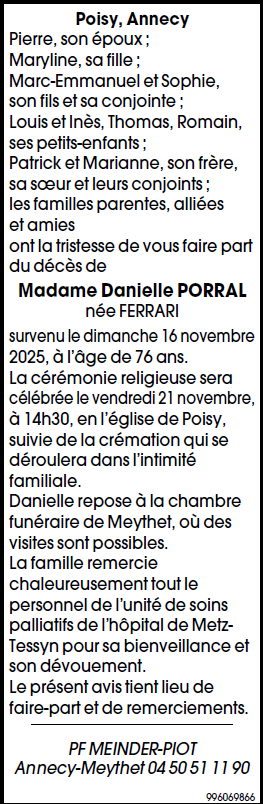 Avis de décès de Madame Danielle PORRAL née FERRARI