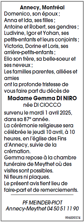 Avis de décès de Madame Gemma DI NIRO née DI CIOCCO