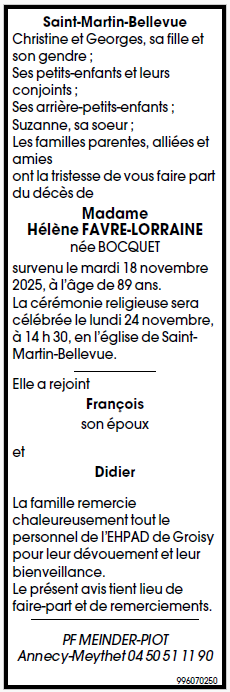 Avis de décès de Madame Hélène FAVRE-LORRAINE née BOCQUET