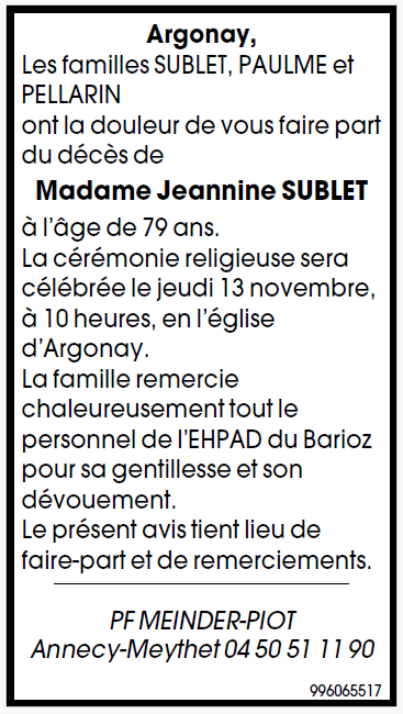 Déroulement des funérailles de Madame Jeannine SUBLET