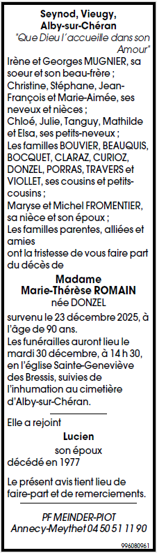 Avis de décès de Madame Marie-Thérèse ROMAIN née DONZEL