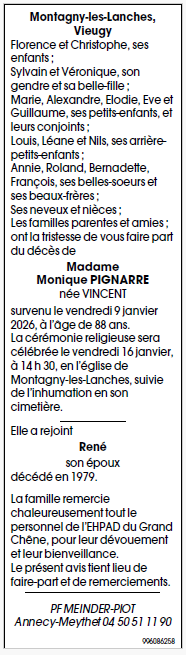Avis de décès de Madame Monique PIGNARRE née VINCENT