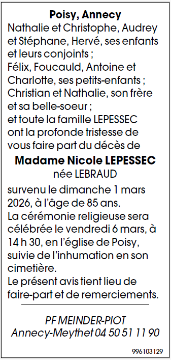 Avis de décès de Madame Nicole LEPESSEC née LEBRAUD