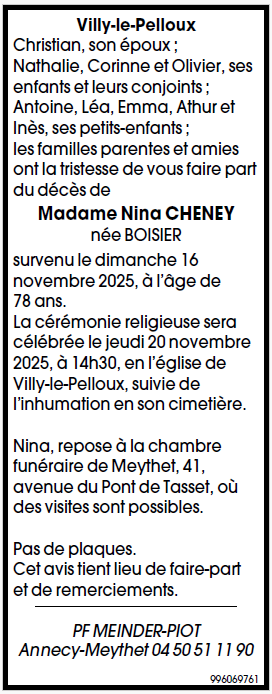 Avis de décès de Madame Nina CHENEY née BOISIER