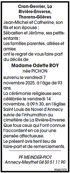 Avis de décès de Madame Odette ROY née PICHON