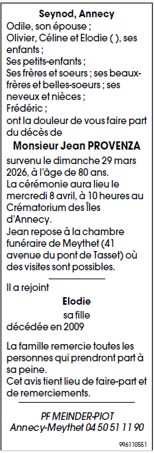Avis de décès de Monsieur Jean PROVENZA