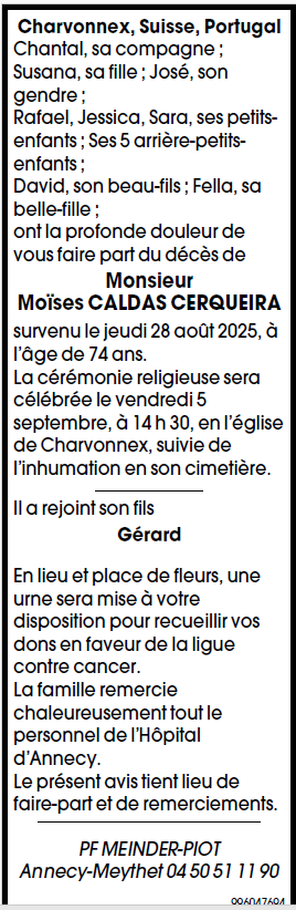 Avis de décès de Monsieur Moïses CALDAS CERQUEIRA